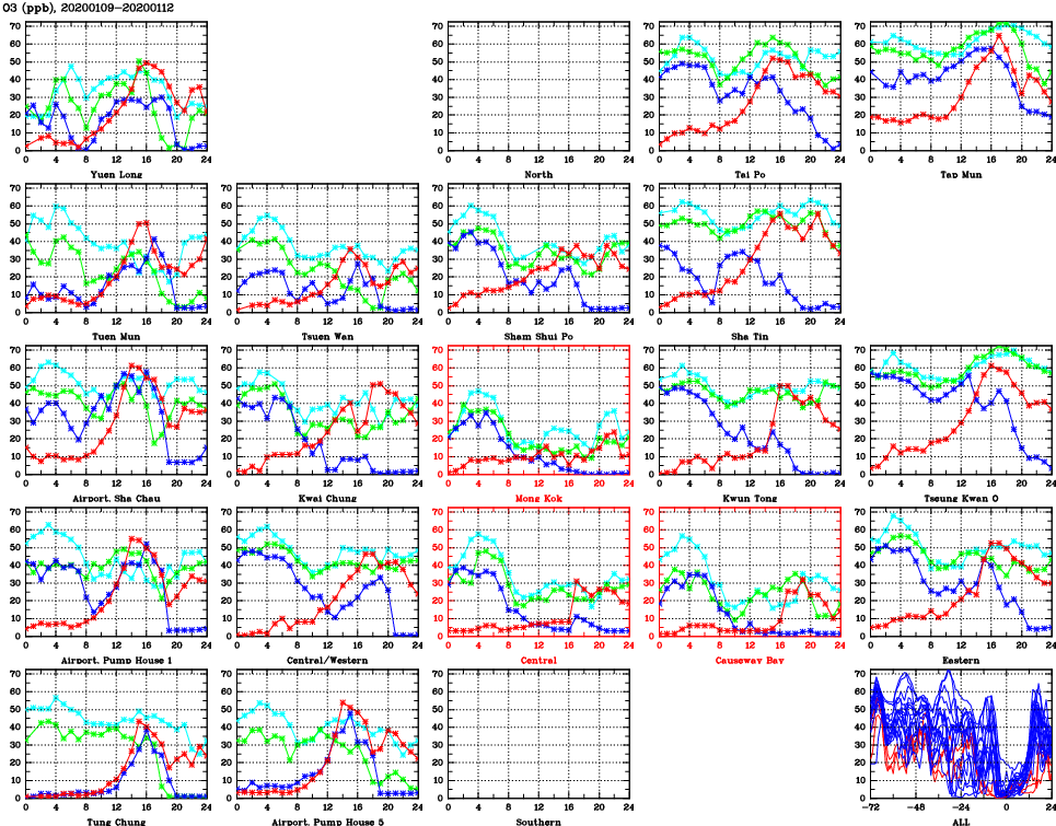 | Air Quality Data Time Series for O3 (2020/01/12) | ( Line colors: Day -3 Day -2 Day -1 Current day ) | 2D Map Current AQHI |