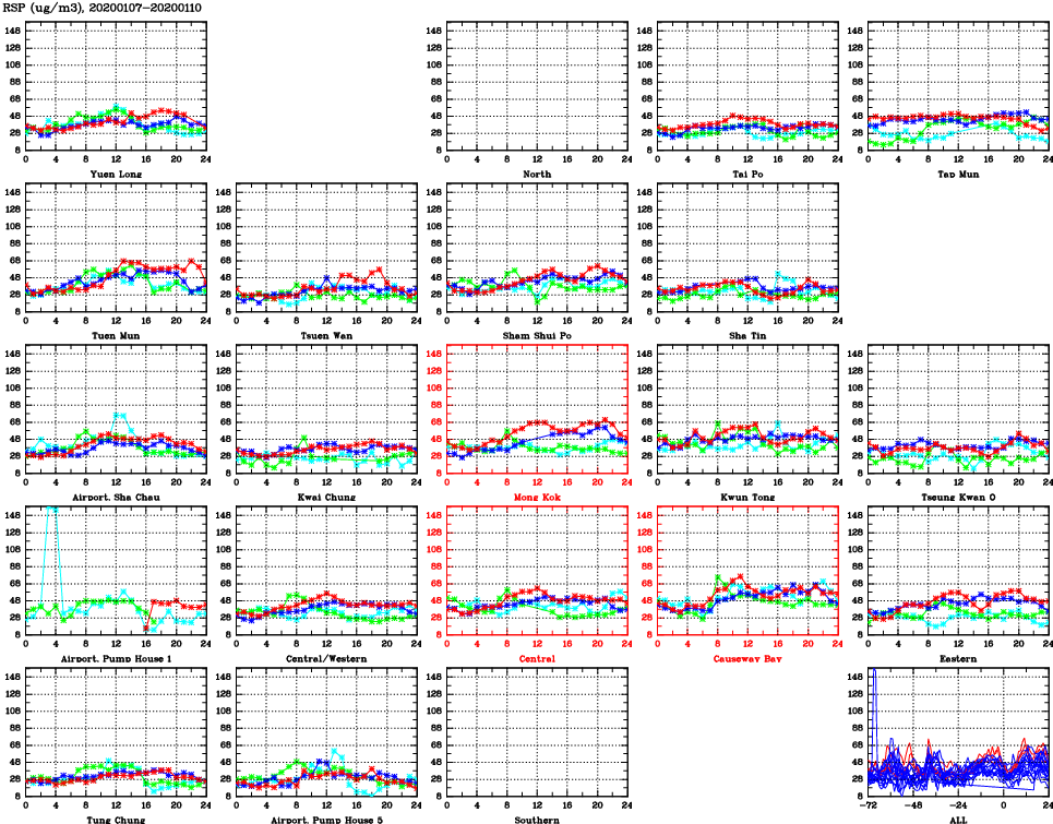 | Air Quality Data Time Series for RSP (2020/01/10) | ( Line colors: Day -3 Day -2 Day -1 Current day ) | 2D Map Current AQHI |