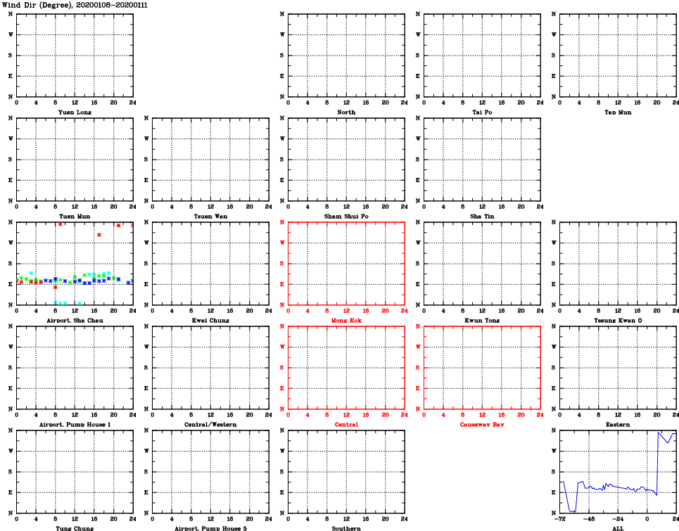 | Air Quality Data Time Series for WD (2020/01/11) | ( Line colors: Day -3 Day -2 Day -1 Current day ) | 2D Map Current AQHI |