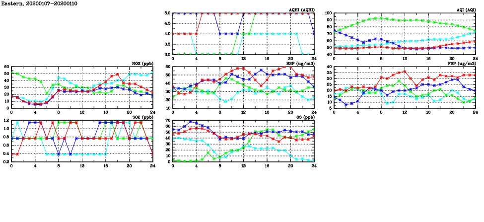 | Air Quality Data Time Series in Eastern (2020/01/10) | ( Line colors: Day -3 Day -2 Day -1 Current day ) | 2D Map Current AQHI |