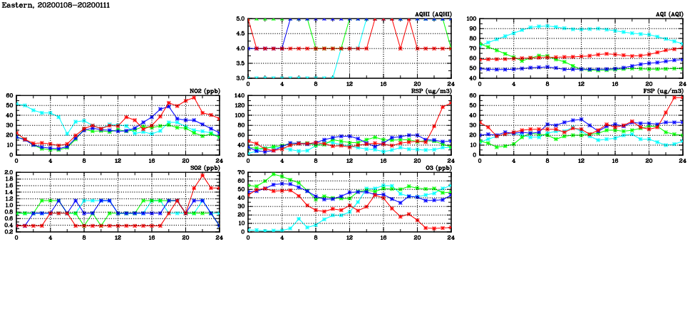 | Air Quality Data Time Series in Eastern (2020/01/11) | ( Line colors: Day -3 Day -2 Day -1 Current day ) | 2D Map Current AQHI |