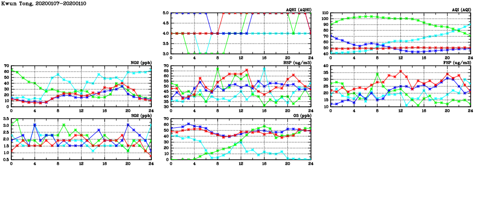 | Air Quality Data Time Series in Kwun Tong (2020/01/10) | ( Line colors: Day -3 Day -2 Day -1 Current day ) | 2D Map Current AQHI |