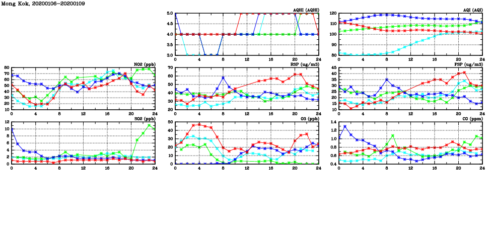 | Air Quality Data Time Series in Mong Kok (2020/01/09) | ( Line colors: Day -3 Day -2 Day -1 Current day ) | 2D Map Current AQHI |