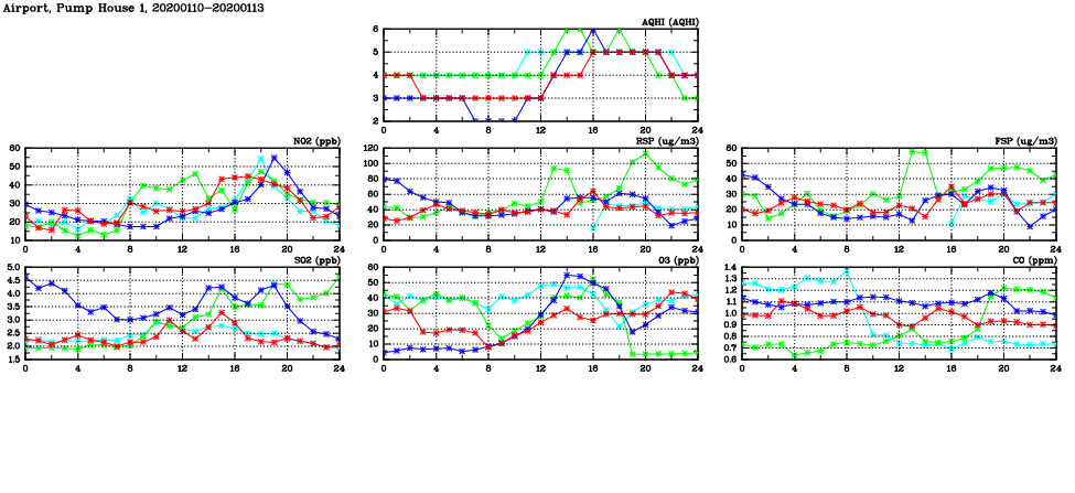 | Air Quality Data Time Series in Airport, Pump House 1 (2020/01/13) | ( Line colors: Day -3 Day -2 Day -1 Current day ) | 2D Map Current AQHI |