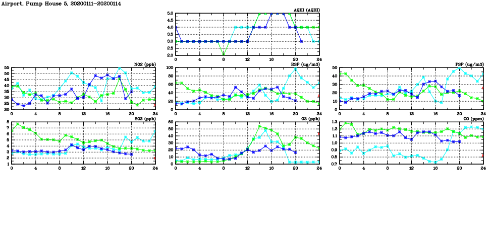 | Air Quality Data Time Series in Airport, Pump House 5 (2020/01/14) | ( Line colors: Day -3 Day -2 Day -1 Current day ) | 2D Map Current AQHI |