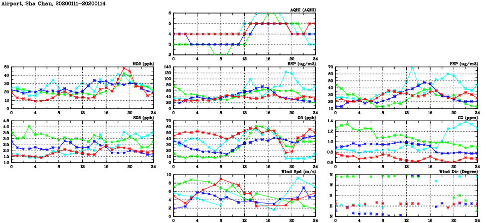 | Air Quality Data Time Series in Airport, Sha Chau (2020/01/14) | ( Line colors: Day -3 Day -2 Day -1 Current day ) | 2D Map Current AQHI |