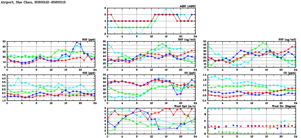 | Air Quality Data Time Series in Airport, Sha Chau (2020/01/15) | ( Line colors: Day -3 Day -2 Day -1 Current day ) | 2D Map Current AQHI |