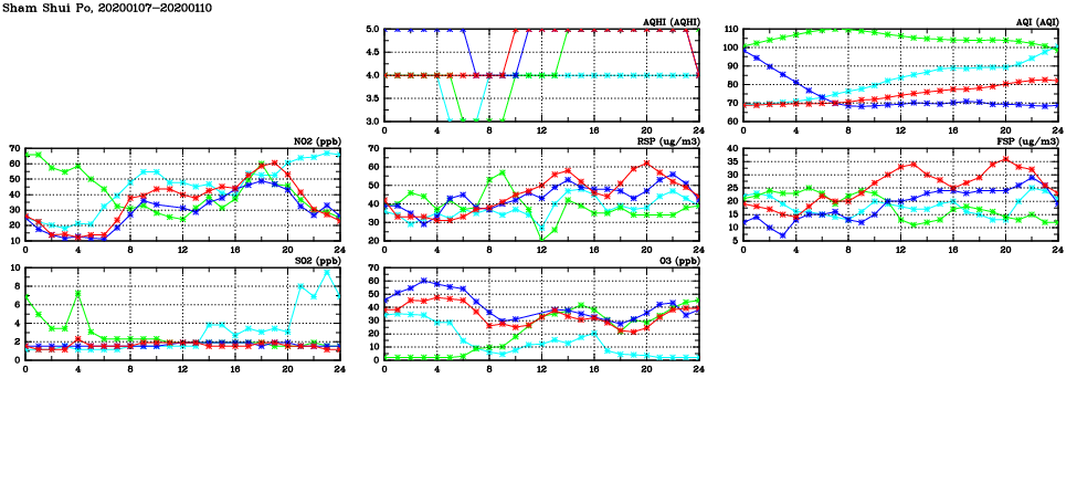 | Air Quality Data Time Series in Sham Shui Po (2020/01/10) | ( Line colors: Day -3 Day -2 Day -1 Current day ) | 2D Map Current AQHI |