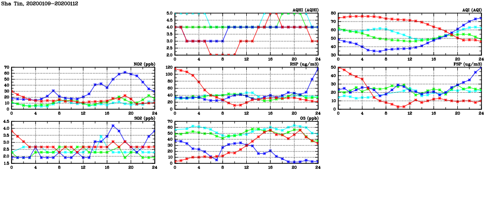 | Air Quality Data Time Series in Sha Tin (2020/01/12) | ( Line colors: Day -3 Day -2 Day -1 Current day ) | 2D Map Current AQHI |