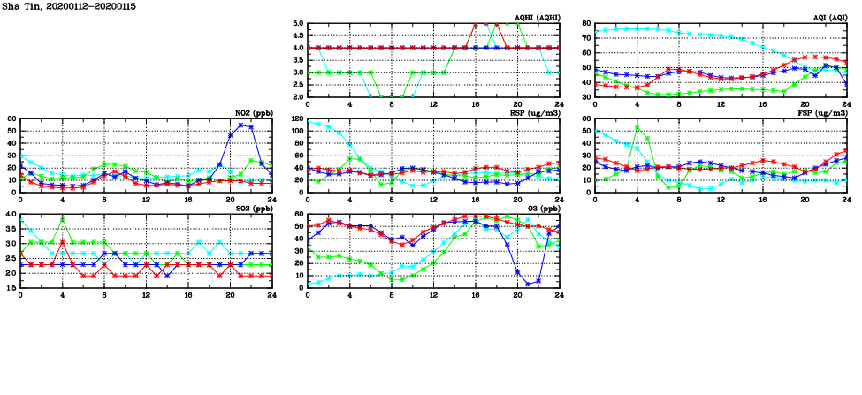 | Air Quality Data Time Series in Sha Tin (2020/01/15) | ( Line colors: Day -3 Day -2 Day -1 Current day ) | 2D Map Current AQHI |