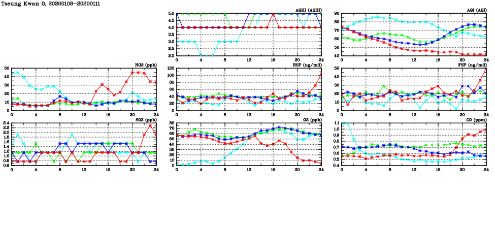 | Air Quality Data Time Series in Tseung Kwan O (2020/01/11) | ( Line colors: Day -3 Day -2 Day -1 Current day ) | 2D Map Current AQHI |