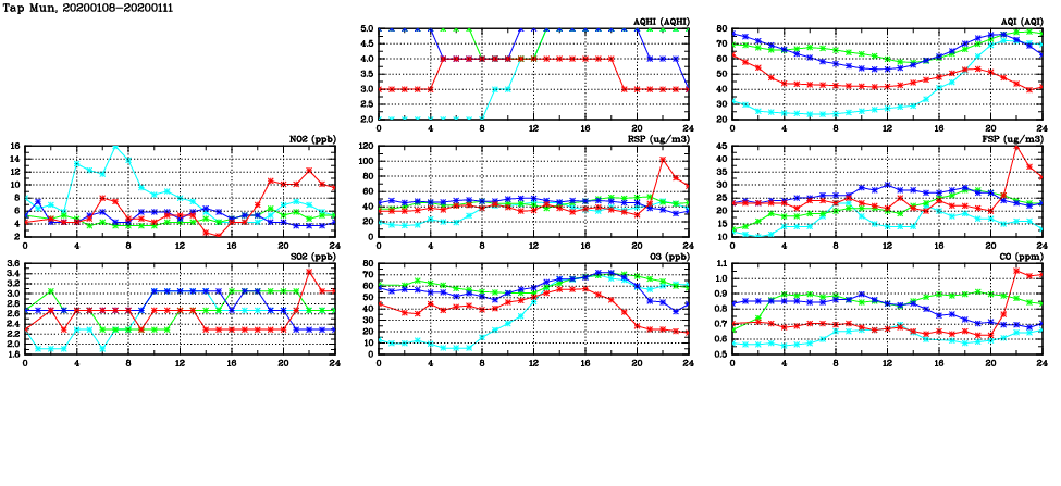 | Air Quality Data Time Series in Tap Mun (2020/01/11) | ( Line colors: Day -3 Day -2 Day -1 Current day ) | 2D Map Current AQHI |