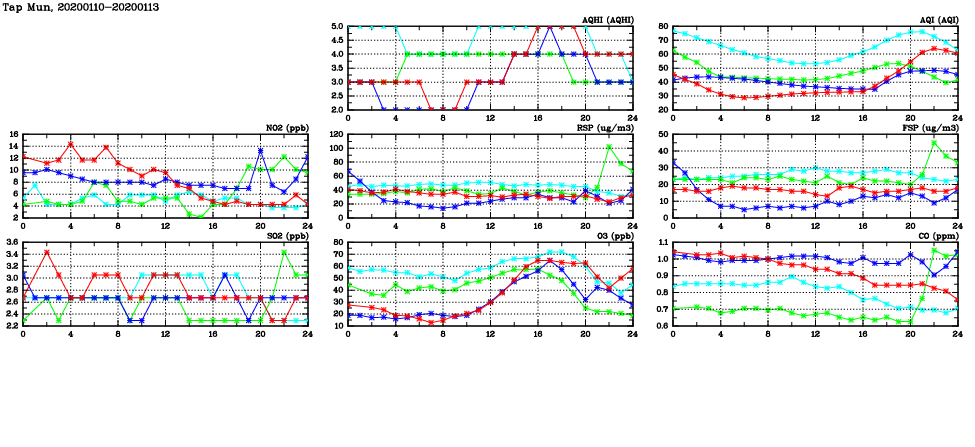 | Air Quality Data Time Series in Tap Mun (2020/01/13) | ( Line colors: Day -3 Day -2 Day -1 Current day ) | 2D Map Current AQHI |