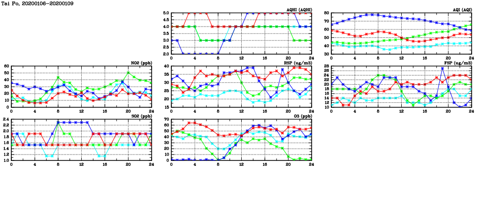| Air Quality Data Time Series in Tai Po (2020/01/09) | ( Line colors: Day -3 Day -2 Day -1 Current day ) | 2D Map Current AQHI |