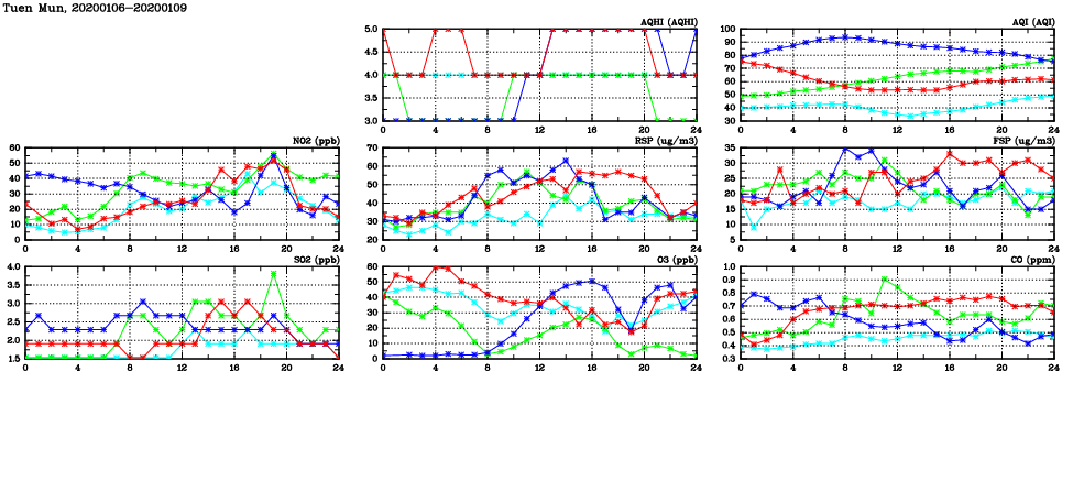 | Air Quality Data Time Series in Tuen Mun (2020/01/09) | ( Line colors: Day -3 Day -2 Day -1 Current day ) | 2D Map Current AQHI |