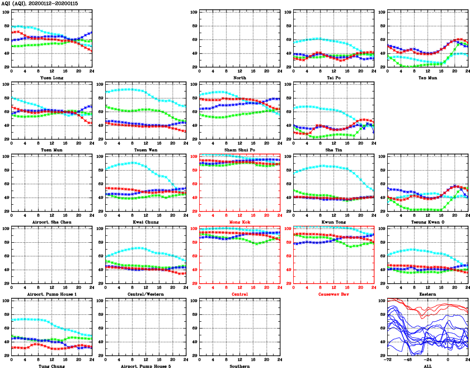 | Air Quality Data Time Series for AQI (2020/01/15) | ( Line colors: Day -3 Day -2 Day -1 Current day ) | 2D Map Current AQHI |