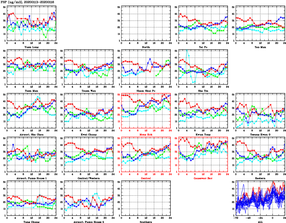| Air Quality Data Time Series for FSP (2020/01/16) | ( Line colors: Day -3 Day -2 Day -1 Current day ) | 2D Map Current AQHI |