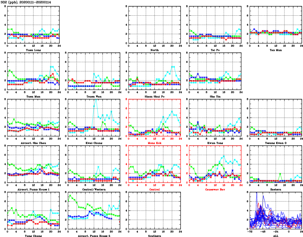 | Air Quality Data Time Series for SO2 (2020/01/14) | ( Line colors: Day -3 Day -2 Day -1 Current day ) | 2D Map Current AQHI |