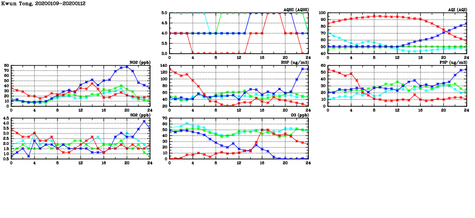 | Air Quality Data Time Series in Kwun Tong (2020/01/12) | ( Line colors: Day -3 Day -2 Day -1 Current day ) | 2D Map Current AQHI |