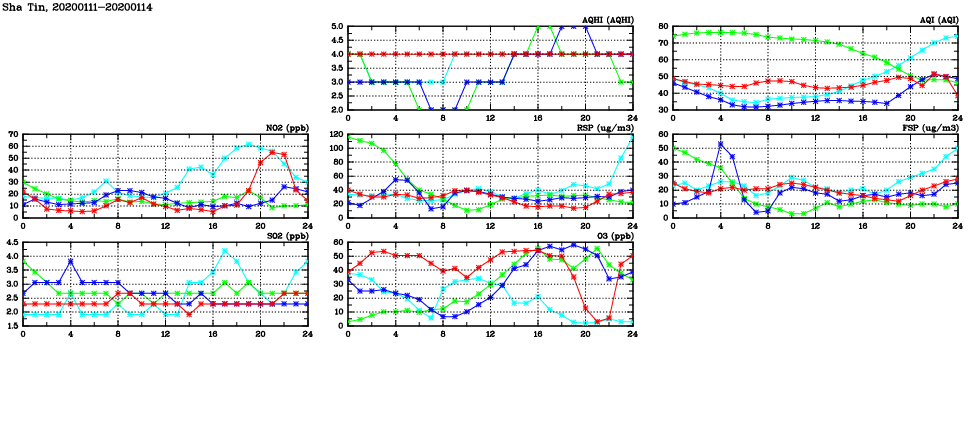 | Air Quality Data Time Series in Sha Tin (2020/01/14) | ( Line colors: Day -3 Day -2 Day -1 Current day ) | 2D Map Current AQHI |