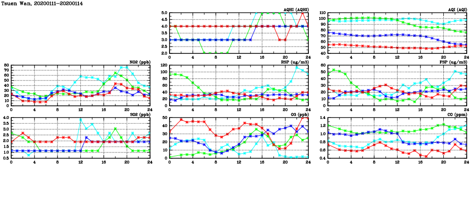 | Air Quality Data Time Series in Tsuen Wan (2020/01/14) | ( Line colors: Day -3 Day -2 Day -1 Current day ) | 2D Map Current AQHI |
