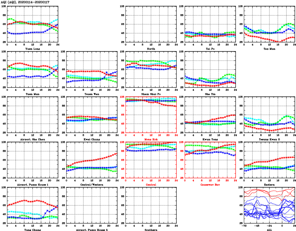 | Air Quality Data Time Series for AQI (2020/01/17) | ( Line colors: Day -3 Day -2 Day -1 Current day ) | 2D Map Current AQHI |