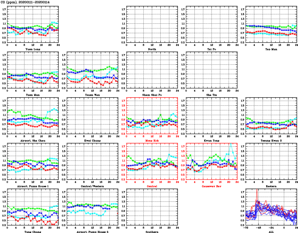 | Air Quality Data Time Series for CO (2020/01/14) | ( Line colors: Day -3 Day -2 Day -1 Current day ) | 2D Map Current AQHI |