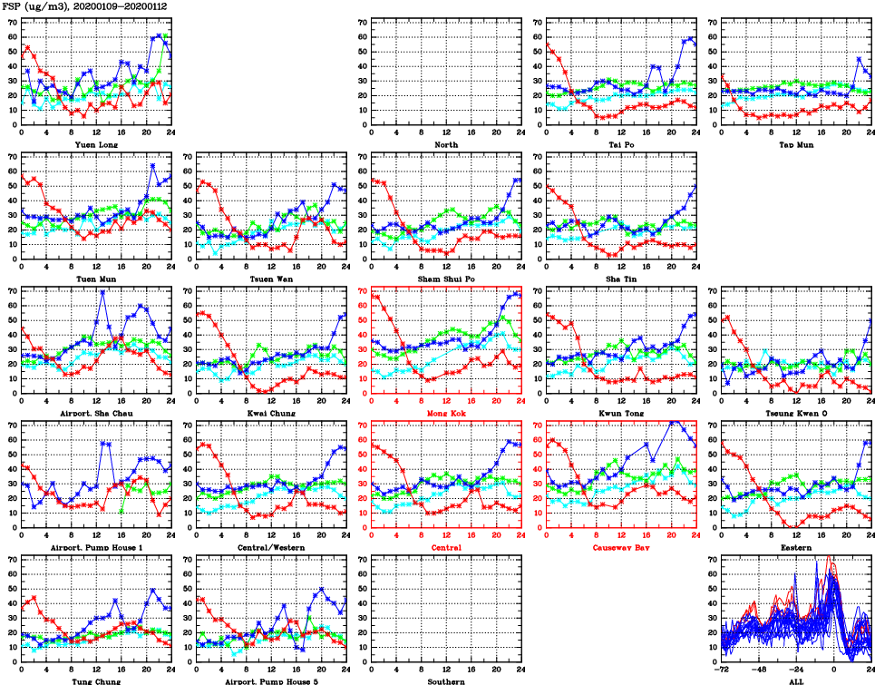 | Air Quality Data Time Series for FSP (2020/01/12) | ( Line colors: Day -3 Day -2 Day -1 Current day ) | 2D Map Current AQHI |