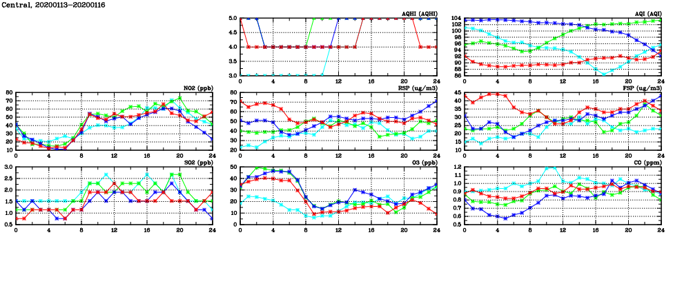 | Air Quality Data Time Series in Central (2020/01/16) | ( Line colors: Day -3 Day -2 Day -1 Current day ) | 2D Map Current AQHI |