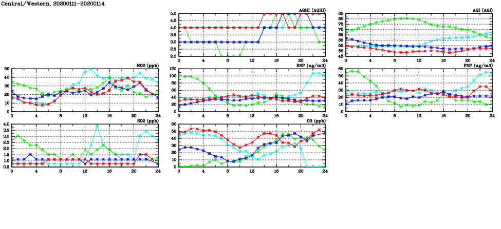 | Air Quality Data Time Series in Central/Western (2020/01/14) | ( Line colors: Day -3 Day -2 Day -1 Current day ) | 2D Map Current AQHI |