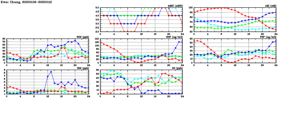 | Air Quality Data Time Series in Kwai Chung (2020/01/12) | ( Line colors: Day -3 Day -2 Day -1 Current day ) | 2D Map Current AQHI |