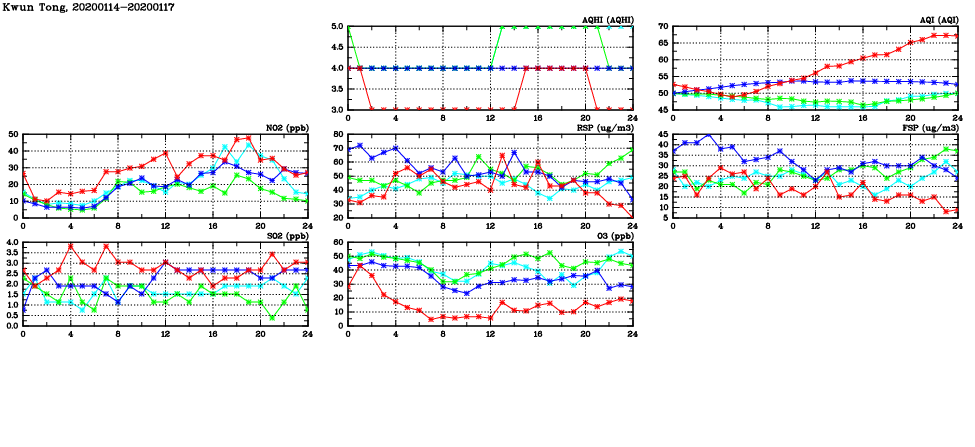 | Air Quality Data Time Series in Kwun Tong (2020/01/17) | ( Line colors: Day -3 Day -2 Day -1 Current day ) | 2D Map Current AQHI |