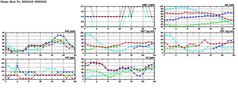 | Air Quality Data Time Series in Sham Shui Po (2020/01/15) | ( Line colors: Day -3 Day -2 Day -1 Current day ) | 2D Map Current AQHI |