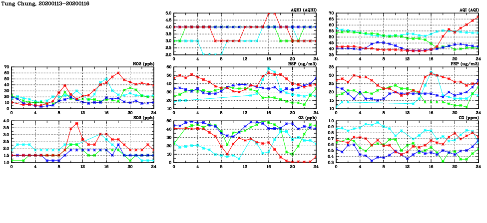 | Air Quality Data Time Series in Tung Chung (2020/01/16) | ( Line colors: Day -3 Day -2 Day -1 Current day ) | 2D Map Current AQHI |