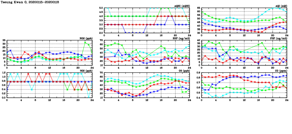 | Air Quality Data Time Series in Tseung Kwan O (2020/01/18) | ( Line colors: Day -3 Day -2 Day -1 Current day ) | 2D Map Current AQHI |