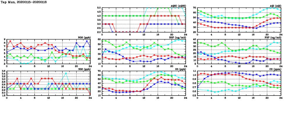 | Air Quality Data Time Series in Tap Mun (2020/01/18) | ( Line colors: Day -3 Day -2 Day -1 Current day ) | 2D Map Current AQHI |