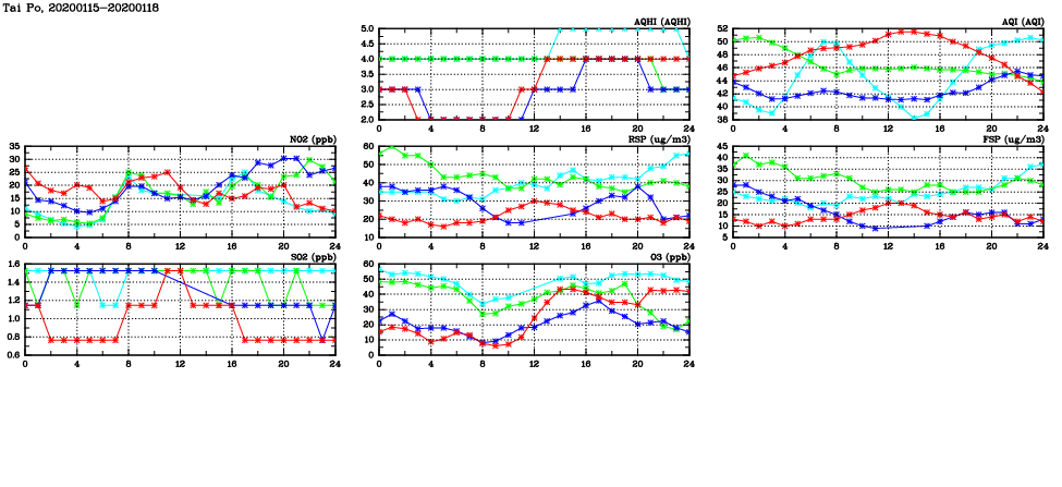 | Air Quality Data Time Series in Tai Po (2020/01/18) | ( Line colors: Day -3 Day -2 Day -1 Current day ) | 2D Map Current AQHI |
