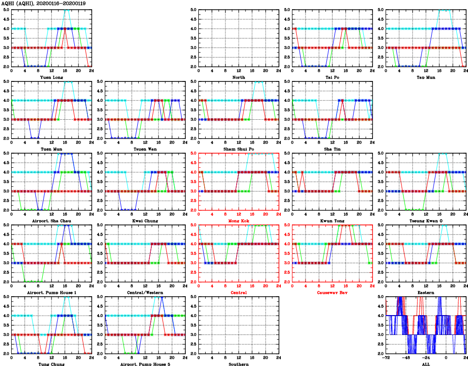 | Air Quality Data Time Series for AQHI (2020/01/19) | ( Line colors: Day -3 Day -2 Day -1 Current day ) | 2D Map Current AQHI |