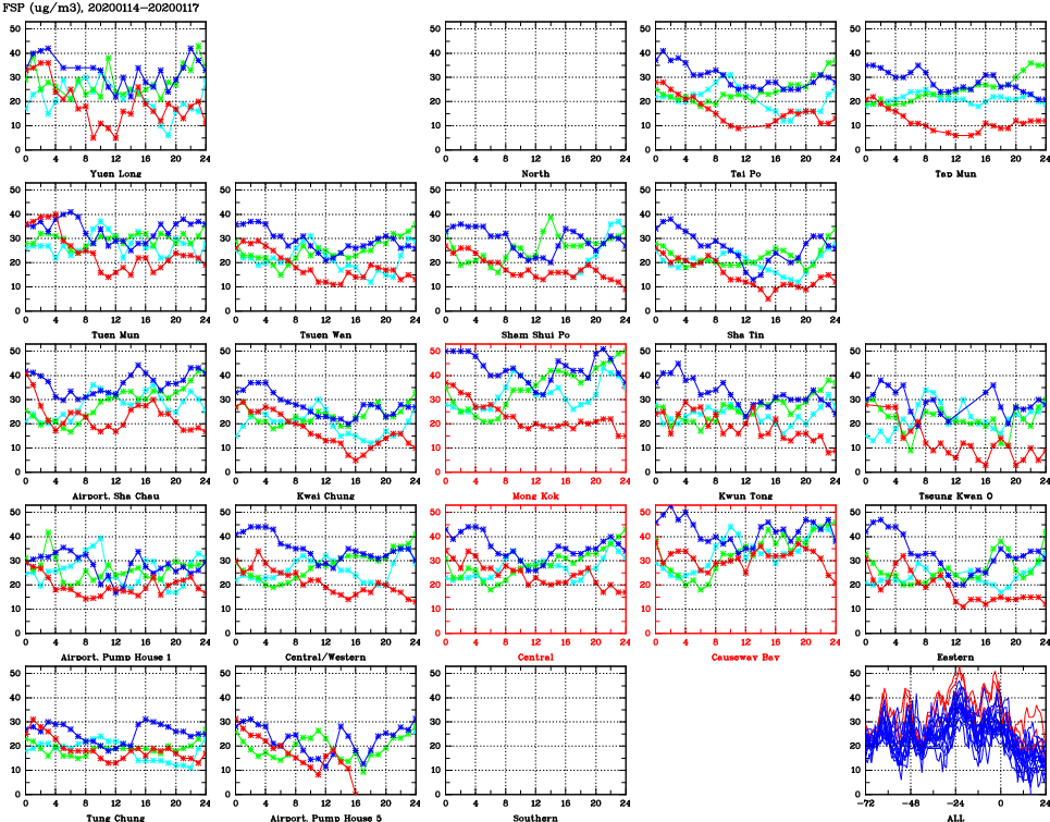 | Air Quality Data Time Series for FSP (2020/01/17) | ( Line colors: Day -3 Day -2 Day -1 Current day ) | 2D Map Current AQHI |