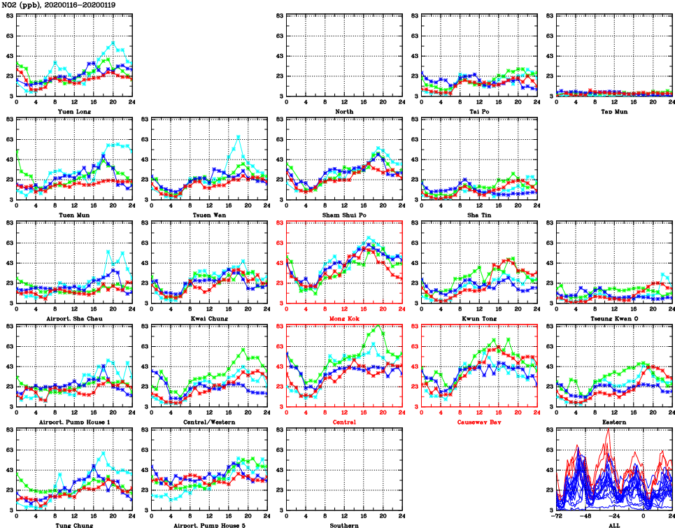 | Air Quality Data Time Series for NO2 (2020/01/19) | ( Line colors: Day -3 Day -2 Day -1 Current day ) | 2D Map Current AQHI |