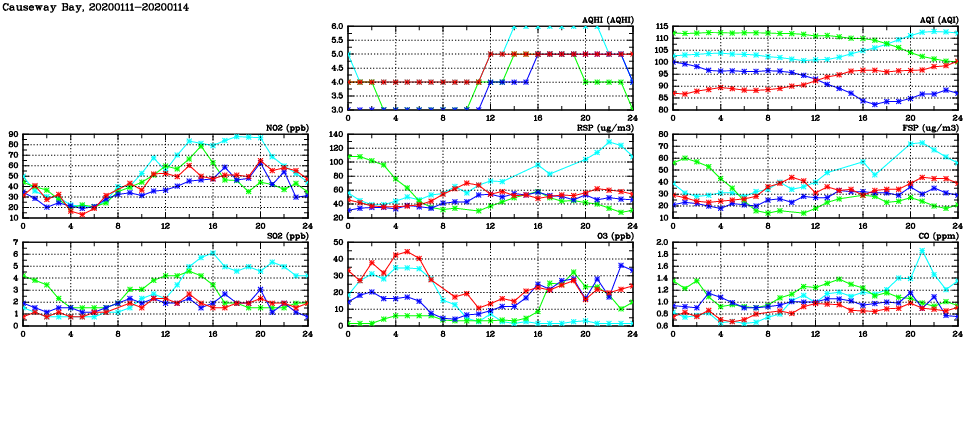 | Air Quality Data Time Series in Causeway Bay (2020/01/14) | ( Line colors: Day -3 Day -2 Day -1 Current day ) | 2D Map Current AQHI |