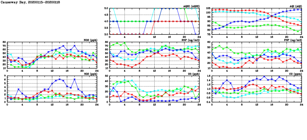 | Air Quality Data Time Series in Causeway Bay (2020/01/18) | ( Line colors: Day -3 Day -2 Day -1 Current day ) | 2D Map Current AQHI |