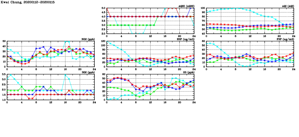 | Air Quality Data Time Series in Kwai Chung (2020/01/15) | ( Line colors: Day -3 Day -2 Day -1 Current day ) | 2D Map Current AQHI |