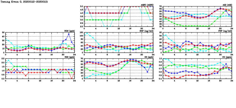 | Air Quality Data Time Series in Tseung Kwan O (2020/01/15) | ( Line colors: Day -3 Day -2 Day -1 Current day ) | 2D Map Current AQHI |
