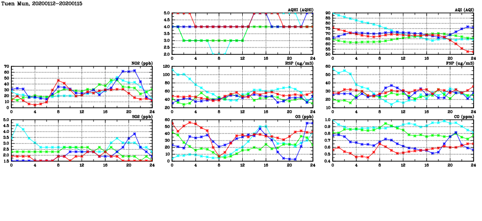 | Air Quality Data Time Series in Tuen Mun (2020/01/15) | ( Line colors: Day -3 Day -2 Day -1 Current day ) | 2D Map Current AQHI |
