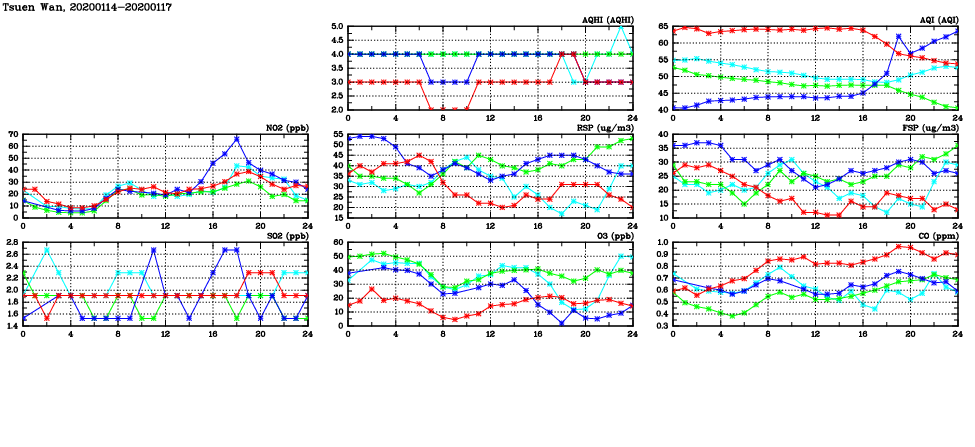 | Air Quality Data Time Series in Tsuen Wan (2020/01/17) | ( Line colors: Day -3 Day -2 Day -1 Current day ) | 2D Map Current AQHI |
