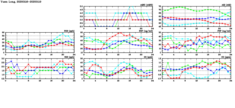 | Air Quality Data Time Series in Yuen Long (2020/01/19) | ( Line colors: Day -3 Day -2 Day -1 Current day ) | 2D Map Current AQHI |