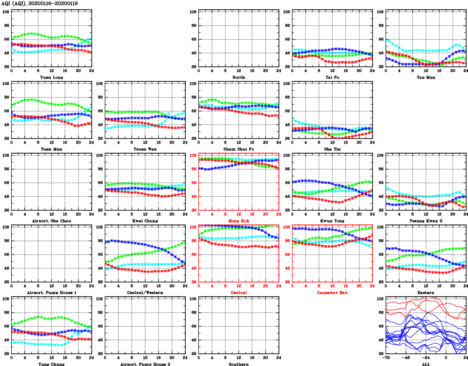| Air Quality Data Time Series for AQI (2020/01/19) | ( Line colors: Day -3 Day -2 Day -1 Current day ) | 2D Map Current AQHI |