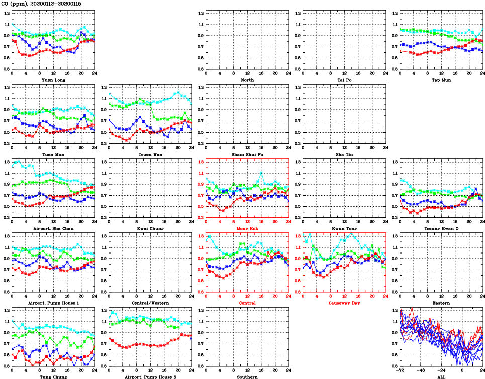 | Air Quality Data Time Series for CO (2020/01/15) | ( Line colors: Day -3 Day -2 Day -1 Current day ) | 2D Map Current AQHI |