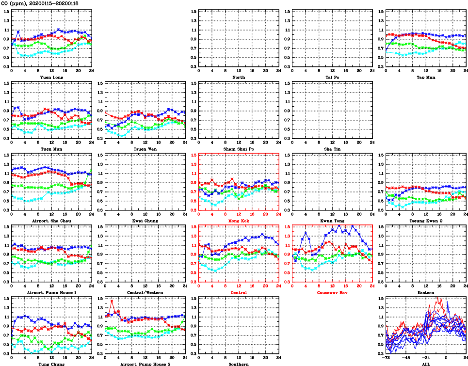 | Air Quality Data Time Series for CO (2020/01/18) | ( Line colors: Day -3 Day -2 Day -1 Current day ) | 2D Map Current AQHI |